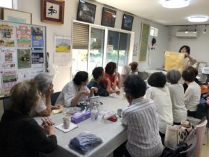 隔週でご利用いただいている「ふれあいサロン成瀬台」では、様々な内容で楽しいひと時を過ごしておられる。手芸やおしゃべりなど和気藹々。今回は仲間に入れて欲しいと見学者も参加し一段と盛り上がっていた。今日のイベントは「玉ねぎの皮で染色」。各自思い思いのデザインで染色を楽しんだ。