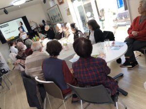 昼食後#は言語聴覚士の こみやゆうかさんによる「レッツ 誤嚥」講座。誤嚥の擬似体験をする事で誤嚥の起きる仕組みや、どうしたら誤嚥性肺炎を防げるか、などを学びました。おっかなびっくりの誤嚥体験(もちろん、やりたい方だけ)をし、真剣に講座を聴き、疑問質問を投げかけて、活発なやり取りができました。昭和薬科大学の大学生も熱心に聞いていました。ご高齢者の生の声が何よりの学びです。
