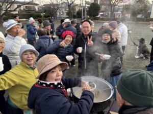 成瀬台ラジオ体操会の年納めに豚汁を作り乾杯の後で皆さまと一緒にいただきました。