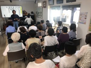 7月6日(木)15時から、声楽家指導による、みんなで歌う会「GAKUと謳おう」が開催された。冒頭は「ボイストレーニング」。腹式呼吸や口の開け方、口の中の状態の説明していただきみんなで発声。その後・季節の歌 ・ロシア民謡 ・寮歌 をみんなで歌い、遠藤先生のカンツォーネに酔いしれた。後半は色々なジャンルの歌を歌い、成瀬台の歌「わたしの町」を合唱。初回開催にも関わらず定員20名を超える皆さんにご参加いただき充実したひと時を過ごすことができた。次回は8月3日(木)の予定。