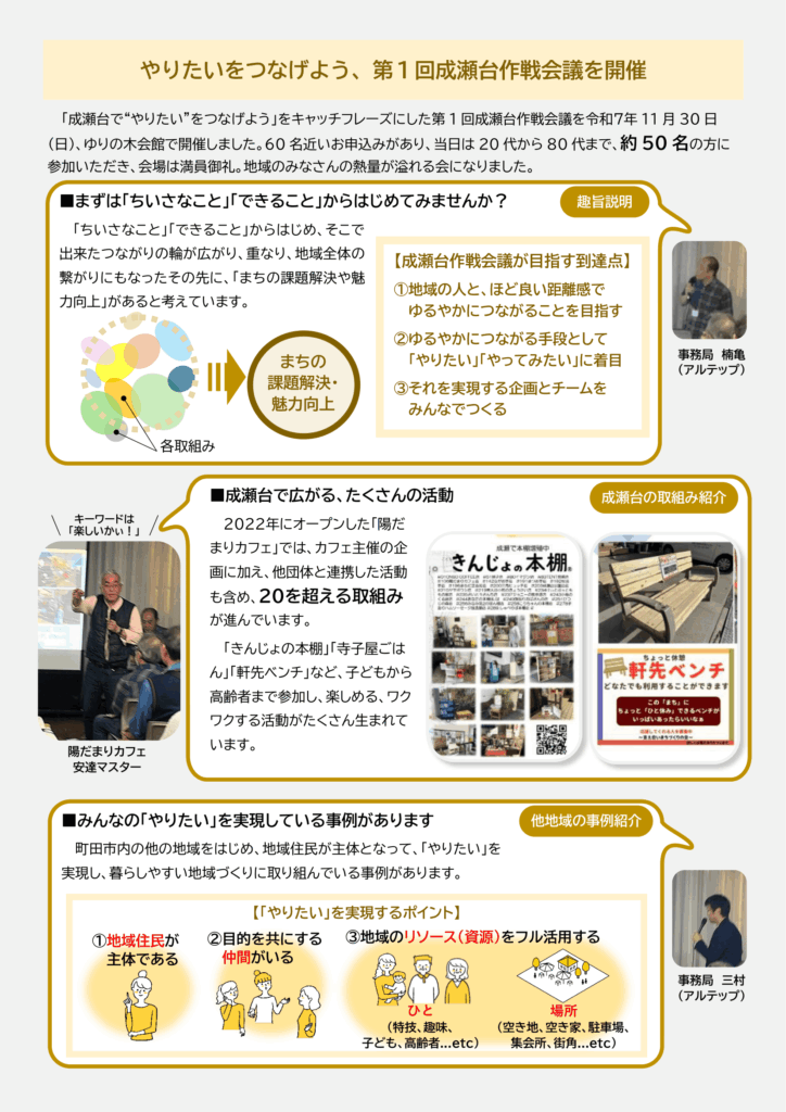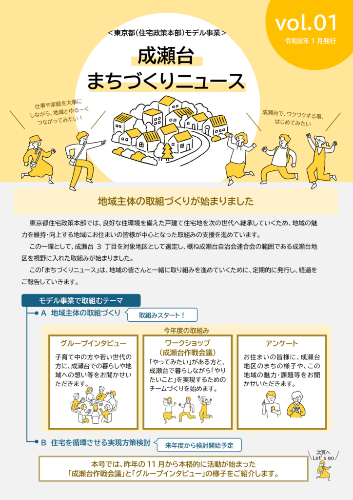 今年度は、町田市成瀬台三丁目地区を「モデル住宅地」として選定させていただき、地域課題の把握や住民の皆様による活動の具体化に向けた支援を実施させていただく予定です。